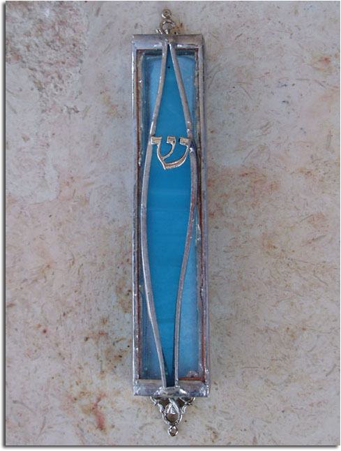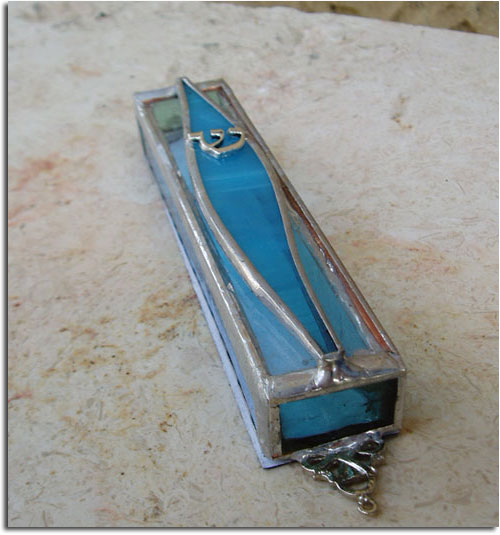 This beautiful stained glass mezuzah is handmade by Chaim Peretz in his workshop in Nachlaot, Jerusalem, Israel. Each piece is unique, completely handcrafted and 100% kosher. The Eternal Flame Mezuza Cover shows a large sterling silver Hebrew shin -- in the middle of a stained glass flame. This is remenisent of the pillar of fire that guided and protected the nation of Israel in the desert. Made from stained glass and sterling silver.