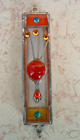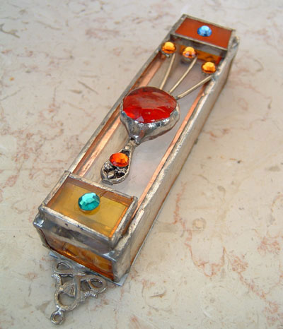 This beautiful stained glass mezuzah is handmade by Chaim Peretz in his workshop in Nachlaot, Jerusalem, Israel. Each piece is unique, completely handcrafted and 100% kosher. Chaim's new art deco series embraces the freedom of the art deco movement and brings light to your doorpost. These mezuzahs just shine with simcha (joy). The shin is the sign of the protection the Almighty provides for Jewish homes. Made from stained glass, silver and crystals.