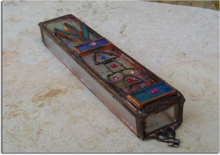 This beautiful stained glass mezuzah is handmade by Chaim Peretz in his workshop in Nachlaot, Jerusalem, Israel. Made from stained glass & copper, the Hebrew letter 'Shin' atop a house. This is a beautiful gift for any home, office, synagogue or for anyone who appreciates fine stained glass work. Each piece is unique, completely handcrafted and 100% kosher Measures: