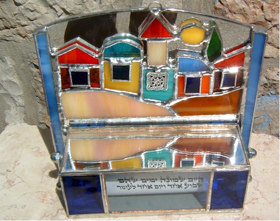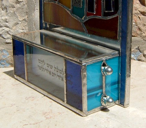Chaim Peretz applies over twenty years of artistic skill to create unique and elegant stained glass and sterling silver Judaica pieces. Chaim works in the old Jerusalem neighborhood of Nachlaot, established in 1885. You can see pictures of Chaim and his studio below. Chaim is a graduate of the College of Stained Glass and Silver of Jerusalem. He has been commissioned to produce stained glass masterpieces for many of the most prestigious synagogues in Israel. including the synagogues in Ramat Eshkol, Armon Hanetziv, Har Nof and Elkana. He has also created numerous stained glass pieces for private homes, in addition to a line of fine Judaica you can have for your home.