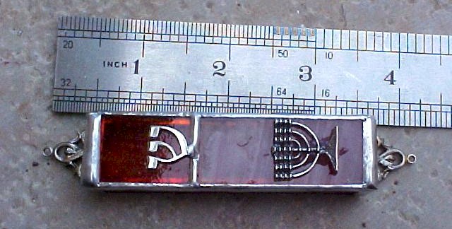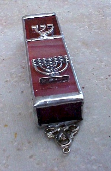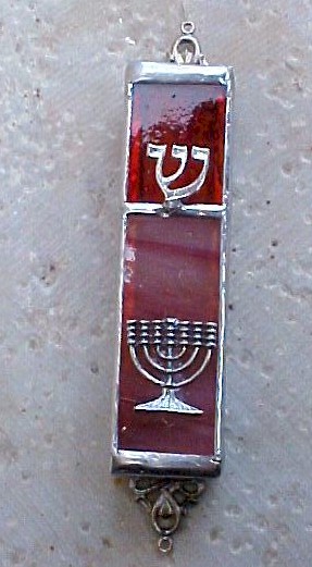 This beautiful stained glass mezuzah is handmade by Chaim Peretz in his workshop in Nachlaot, Jerusalem, Israel. Each piece is unique, completely handcrafted and 100% kosher. The Menorah Mezuza Cover is enchanced by a sterling silver representation of a Menorah and a large Hebrew 'shin' --?. The 'shin' represents the name of the Almighty who protects the home of Jewish people. Made from stained glass and sterling silver.