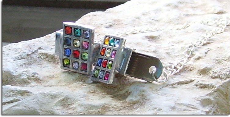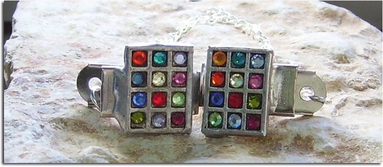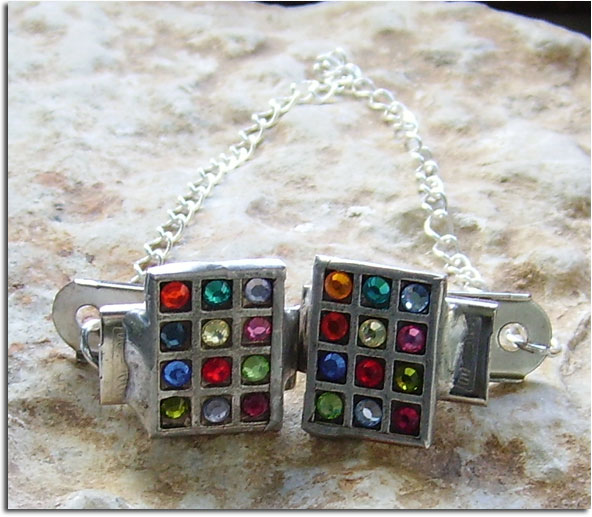 A beautiful set of handmade talit (prayer shawl) clips handmade by Chaim Peretz in his studio in Jerusalem, Israel. The clips are made of silver and crystals. This is a beautiful Bar or Bat mitzvah gift or a gift for someone who has always been looking for that perfect unique pair of talit (talis) clips.