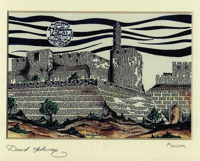 His dual talents are evidenced in the remarkable combinations of writing and decorations on klaf (holy parchments), incorporating symbols and quotations from the Bible, and Jerusalem scapes. Examples of his artistic creations include a Megilat Esther (scroll of the Book of Esther), ktubot (wedding agreements), depictions of pitum haktoret (the Temple incense mixture) and more.