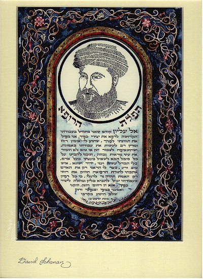 His dual talents are evidenced in the remarkable combinations of writing and decorations on klaf (holy parchments), incorporating symbols and quotations from the Bible, and Jerusalem scapes. Examples of his artistic creations include a Megilat Esther (scroll of the Book of Esther), ktubot (wedding agreements), depictions of pitum haktoret (the Temple incense mixture) and more.